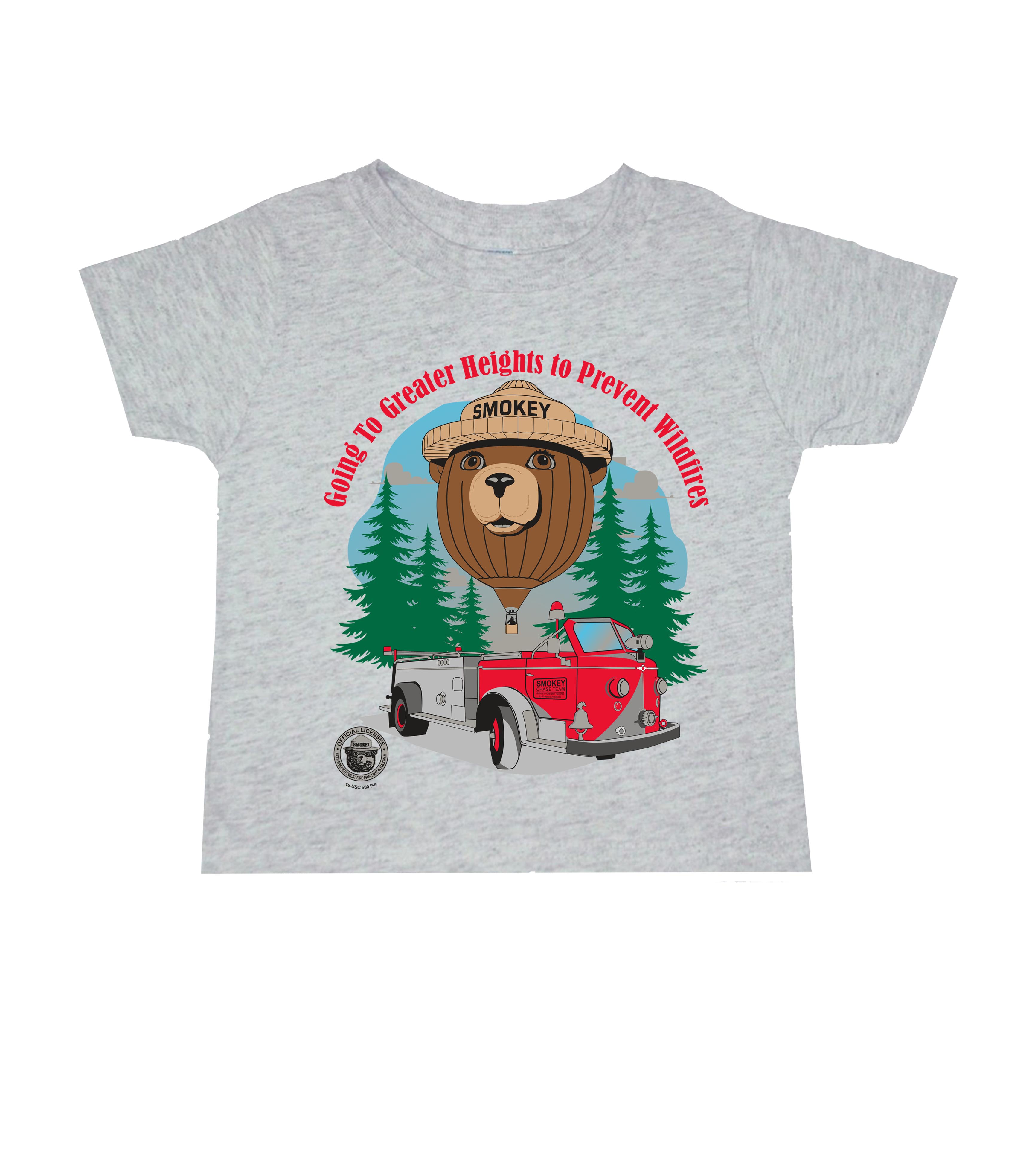 Smokey Bear Balloon with the Smokey Bear fire engine. It is printed on an ash t-shirt and comes in sizes 2T-5T. 100% Per-shrunk cotton.
