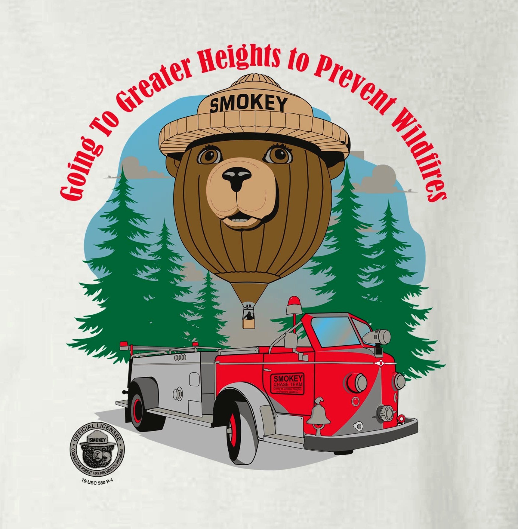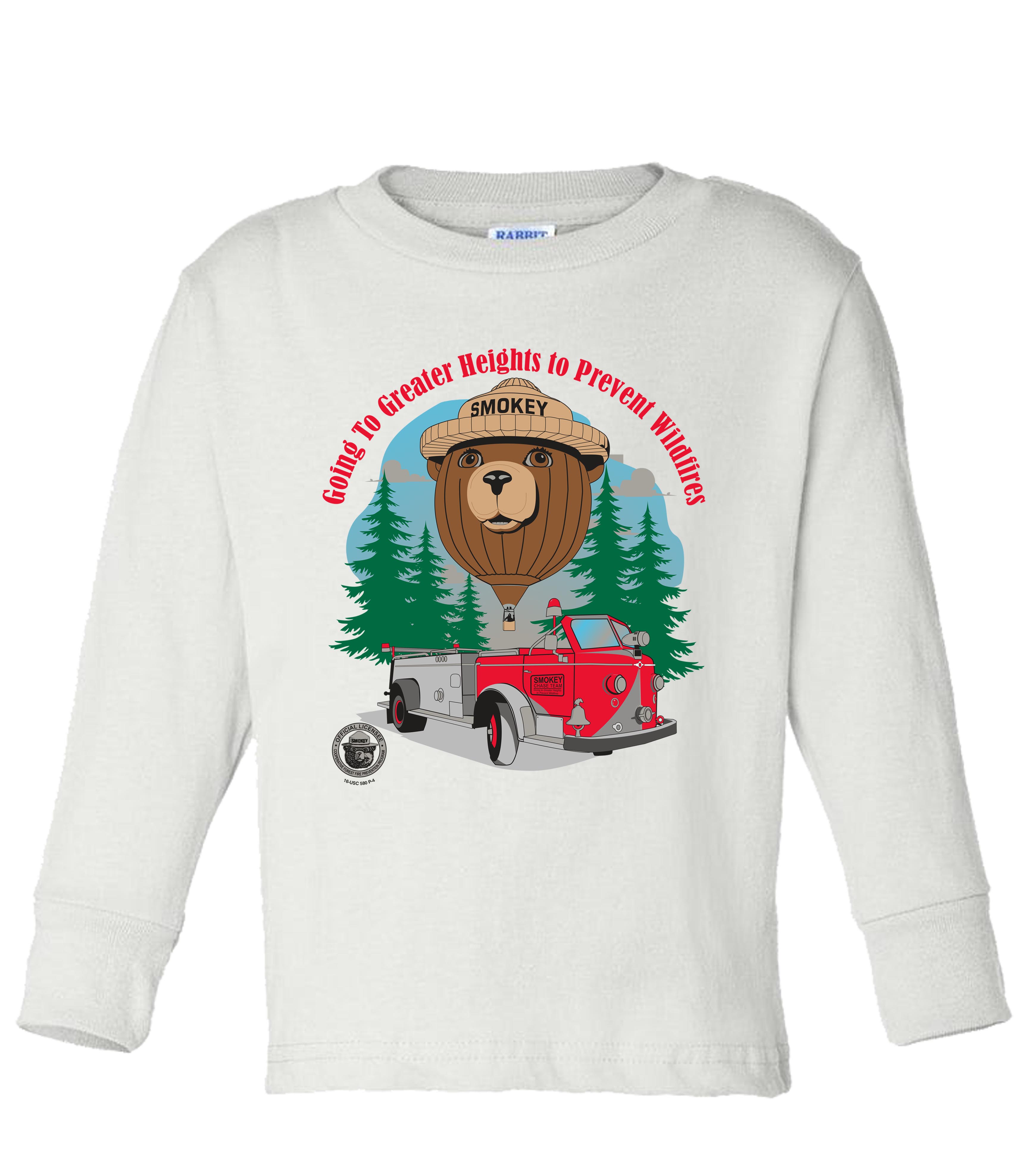 Smokey Bear Balloon with the Smokey Bear Balloon Fire Engine. Printed on a white, long sleeve shirt. It comes in sizes 2T to 5T.