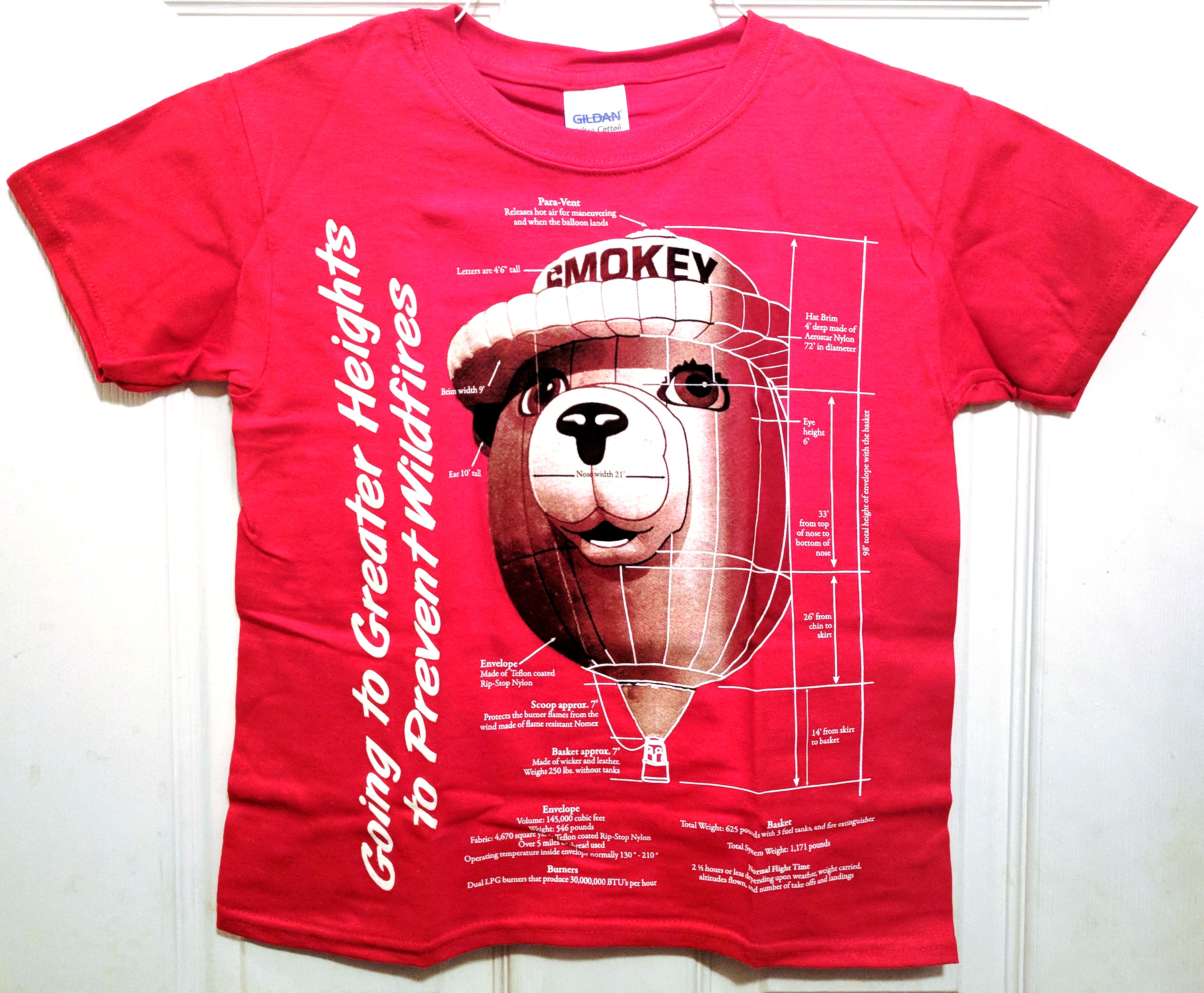 The Facts T-shirt has facts and figures about the Smokey Bear Balloon, from the cap to the basket. It comes in sizes from Small 2-4, Medium 6-8, Large 10-12, XLarge 14-16. 100% Per-shrunk Cotton.