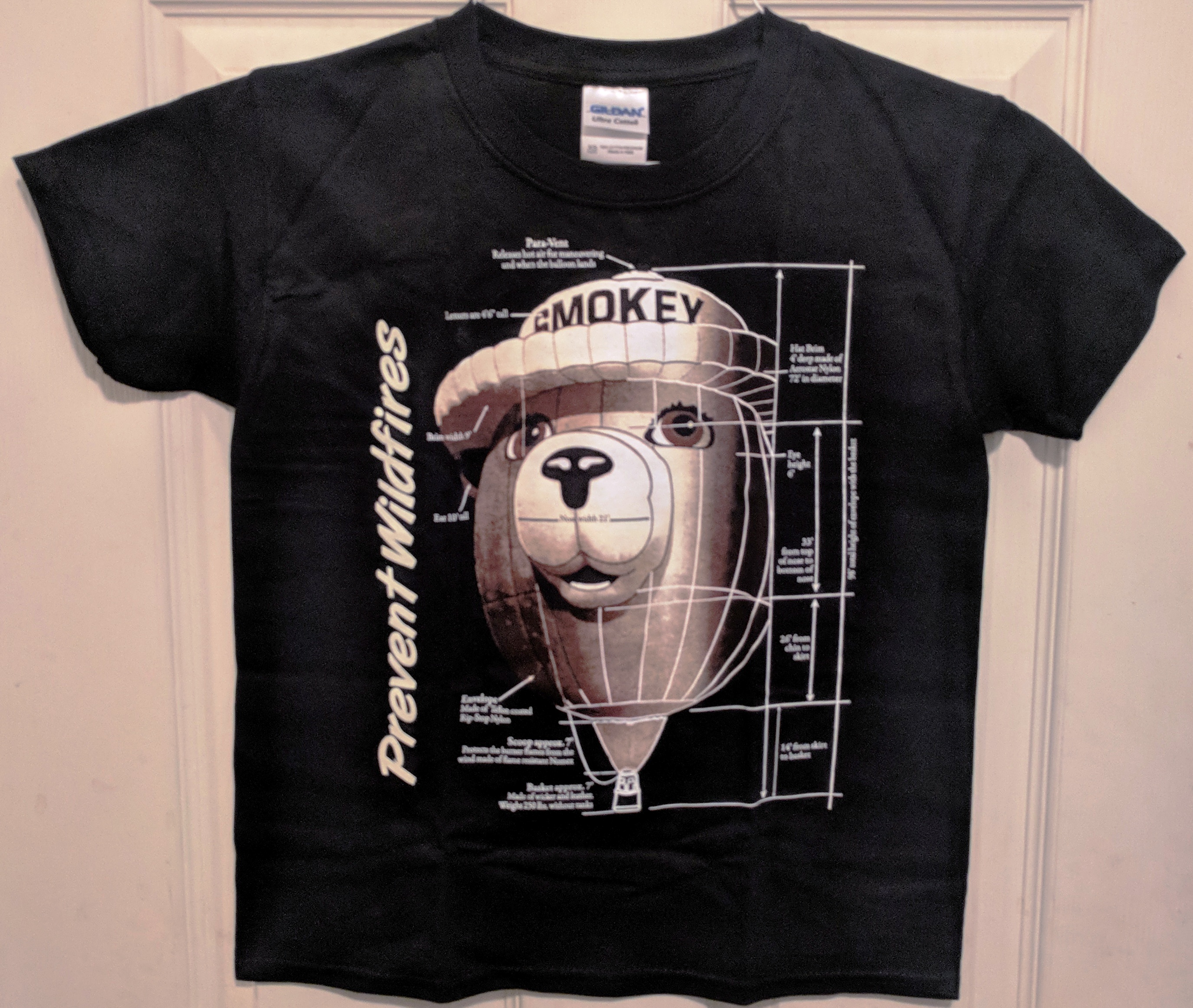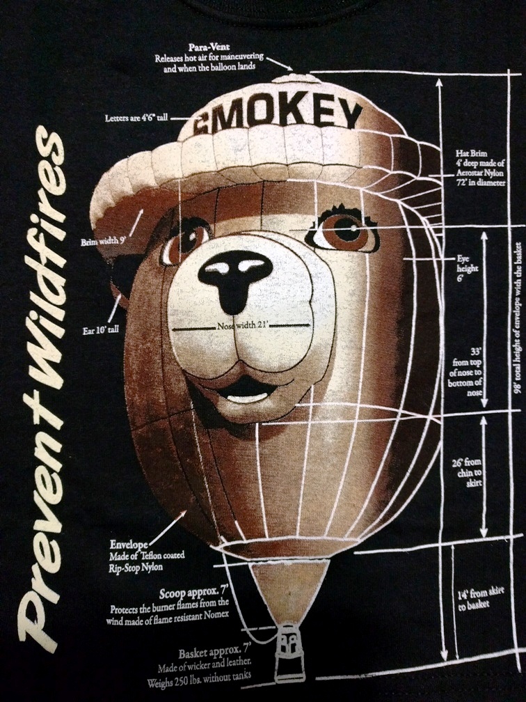 The Facts T-shirt has facts and figures about the Smokey Bear Balloon, from the cap to the basket. It comes in sizes from Small 2-4, Medium 6-8, Large 10-12, XLarge 14-16. 100% Per-shrunk Cotton.