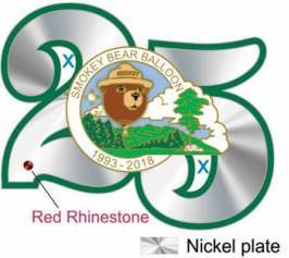 The Smokey Bear Balloon 25 Year pin is a 3 layer pin. The 1st layer is the number 25, which also sports a red rhinestone. The 2nd layer is the back ground of a forest scene and the years 1993 - 2018 on the bottom. The late Bill Chapel, whom championed the balloon, is honored with his initials in one of the clouds in the back ground. The 3rd layer is the Smokey Bear Hot-air Balloon.