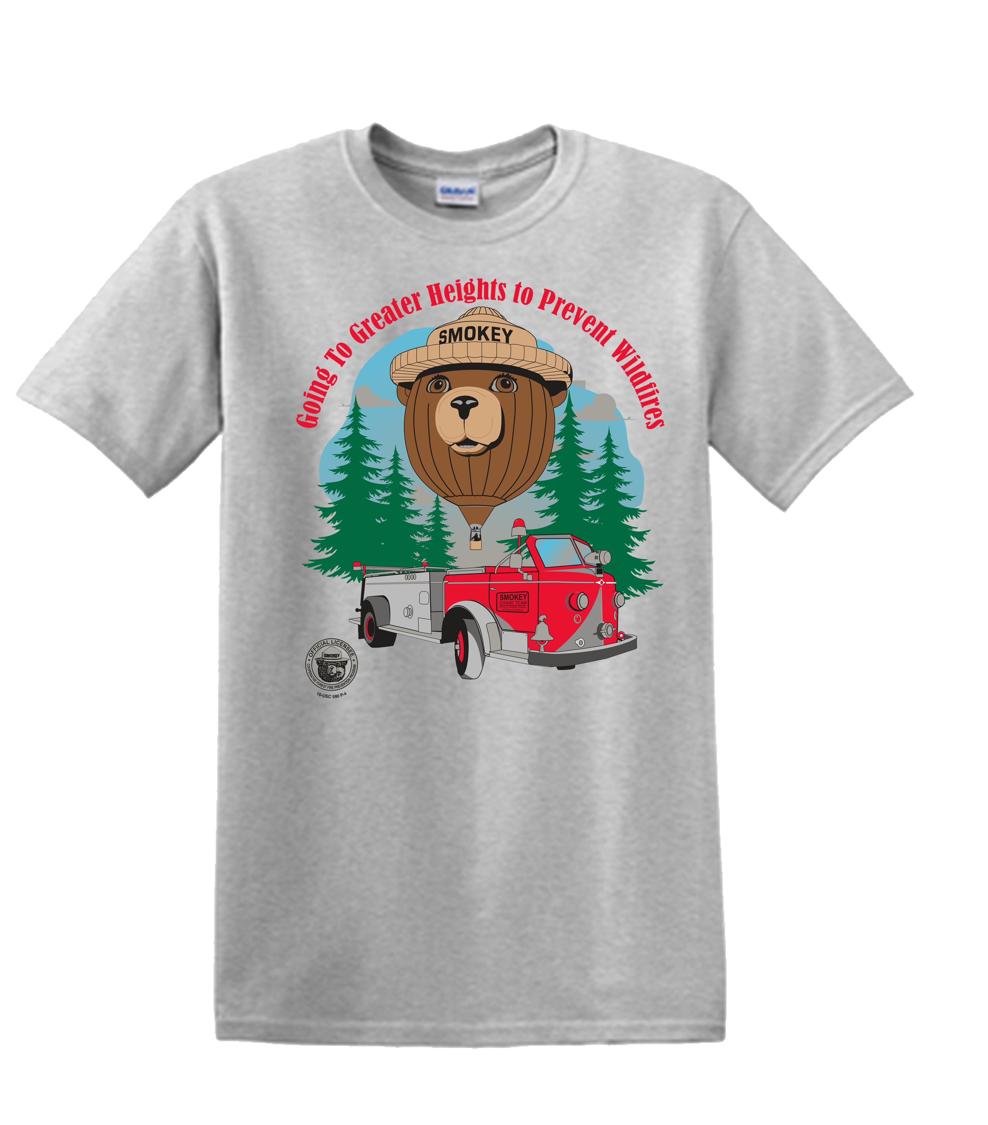 Smokey Bear Balloon with the 1949 Fire Engine t-shirt. Comes in sizes Small to 3XL. Color: Ash 100% Per-shrunk cotton.