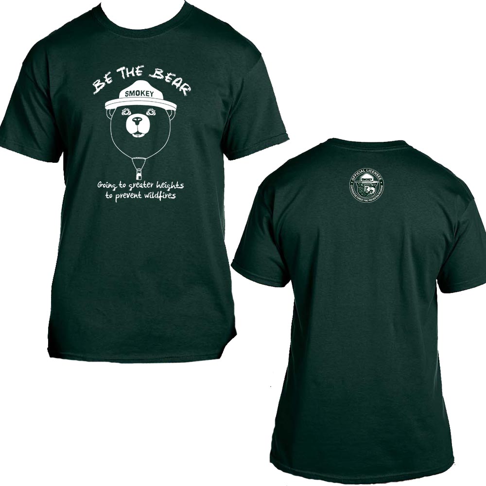 Smokey Bear Balloon printed in white on a forest green t-shirt. Comes in sizes from Small to 3XL. Small to XL are $15.00. 2XL are $18.00 and 3XL are $20.00.