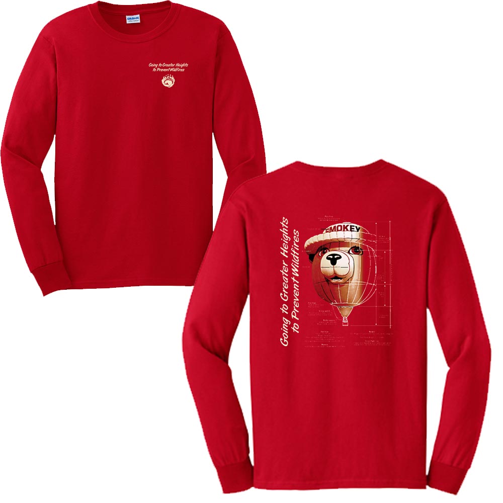 Smokey Bear Balloon Facts Adult long sleeve shirt has all the facts and figures about the Smokey Bear Balloon, from the cap to the basket. 100% Per-shrunk Cotton. Available in Small to 3XL.