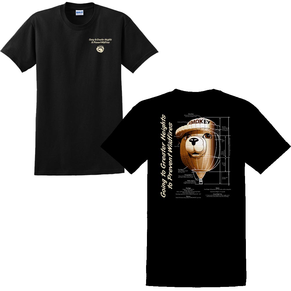 The Smokey Fact shirt has Smokey Bear Balloon facts and figures from the cap to the basket. It is available in sizes from Small to 3XL. 100% Per-shrunk Cotton.
