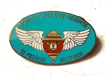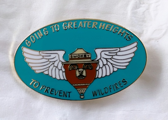 Smokey with Wings is an oblong pin, with a turquoise background, and gold-tone outlining and writing. It measures about 1.25" x 1.75"