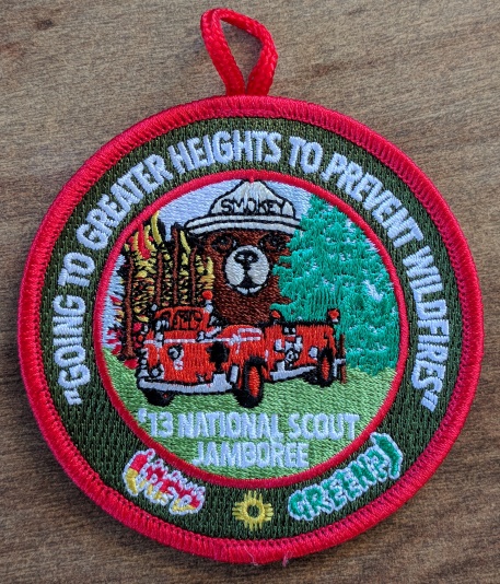 Smokey Bear Balloon patch created for the 2013 National Scout Jamboree. It has a loop at the top, which can be hung, instead of being sewn on. The rim is red and the ring is forest green, which has "Going to Greater Heights To Prevent Wildfires across the top. At the bottom is a red and green chili with the New Mexico State Zia symbol in the middle. It has a 3 1/2" diameter.